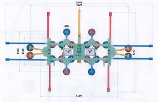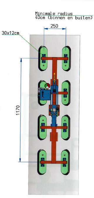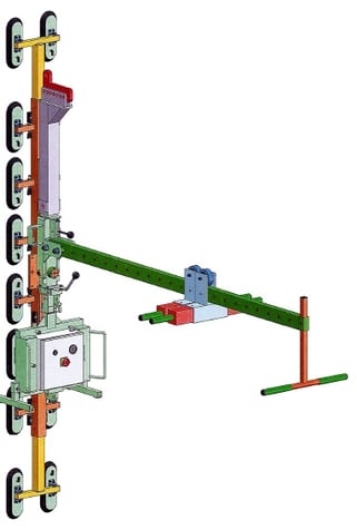De zuiger is speciaal uitgerust met uitvalbeveiliging( de rode en blauwe stangen) voor het hijsen van grote ruiten op grotere hoogtes. Deze kunnen voor het plaatsen van het glas 180° worden gedraaid zodat ze vrij zijn van het glas.
