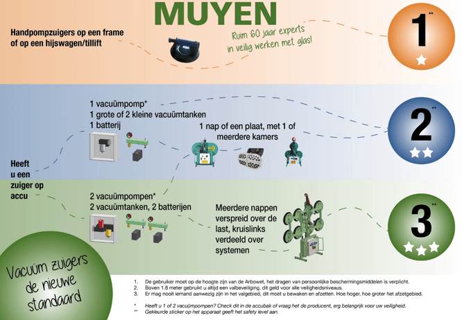 Safety level 2 is volledig gericht op veilig hijsen bij projecten waar het niet mogelijk is een zuiger van safety level 3 in te zetten. De ruimtes zijn beperkt, het glasoppervlak is te klein voor een zuiger met meerder nappen, een lichte tilhulp is noodzakelijk omdat de vloerdruk laag moet blijven of er is zeer weinig ruimte, bijvoorbeeld onder een luifel, bij een vide of bij een trapopgang.